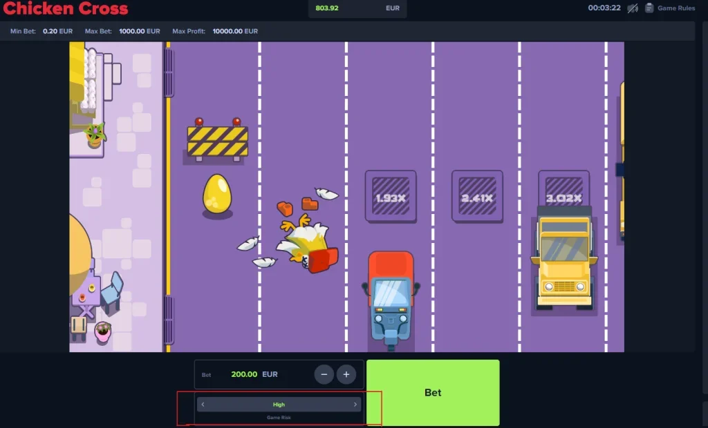 La jugabilidad de Chicken Cross casino 1Win es sencilla, pero sus partidas tienen alta volatilidad. La mecánica sencilla, donde los participantes deben hacer cruzar al pollo por en medio de la calle pero sin ser atropellado.Conforme se va moviendo el pollo, incrementa el riesgo de perder la partida y los fondos aportados. Tras generar un movimiento exitoso, tendrás la oportunidad de decir si continuar o retirar tu ganancia en el momento. Se presentan diferentes niveles de riesgo con hasta x1.000 de premios.
